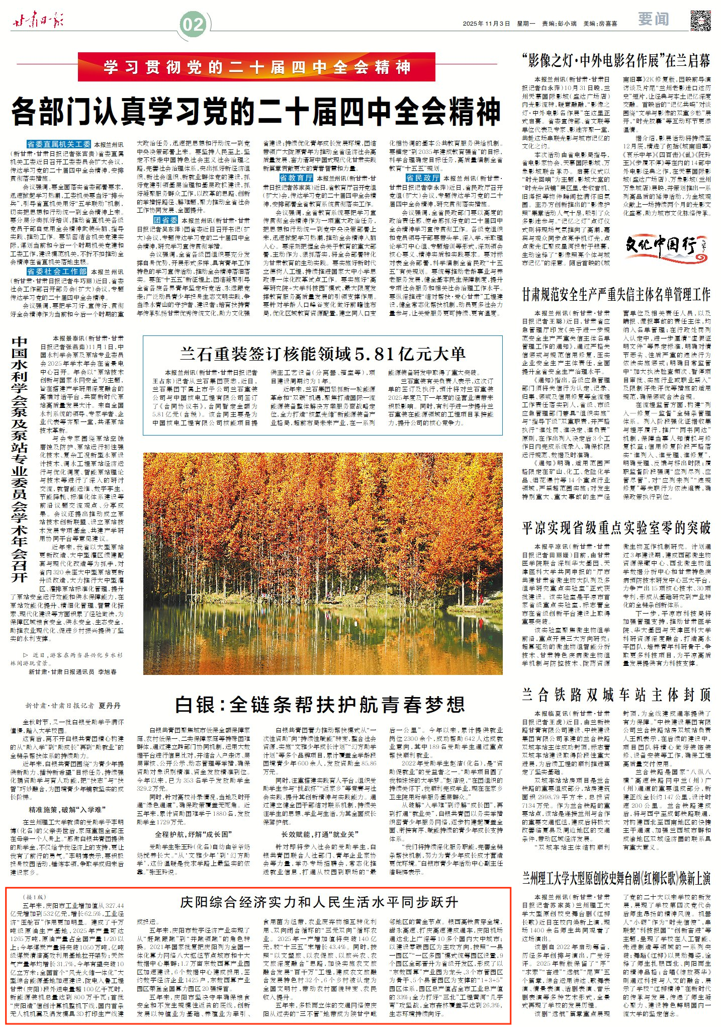 新甘肅客戶端蘭州10月31日訊(新甘肅·甘肅日?qǐng)?bào)記者 王煜宇)記者從今天下午省政府新聞辦召開的“決勝收官‘十四五’ 爭(zhēng)先進(jìn)位話發(fā)展”主題系列新聞發(fā)布會(huì)上獲悉,“十四五”時(shí)期,慶陽市全面落實(shí)省委、省政府提出的“挑大梁、作標(biāo)桿”工作要求和“五地”建設(shè)目標(biāo),圍繞“‘雙輪’驅(qū)動(dòng)、‘三化’并進(jìn)、‘四建’支撐,高質(zhì)量發(fā)展”總體思路,實(shí)現(xiàn)工業(yè)經(jīng)濟(jì)轉(zhuǎn)型升級(jí),數(shù)字經(jīng)濟(jì)異軍突起,鄉(xiāng)村面貌煥然一新,發(fā)展條件持續(xù)改善,呈現(xiàn)出綜合經(jīng)濟(jì)實(shí)力和人民生活水平同步躍升的良好態(tài)勢(shì)。
