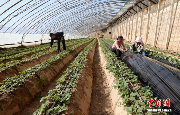 圖為慶陽萬潤園種植養(yǎng)殖農民專業(yè)合作社,種植戶管護草莓。(資料圖)盤小美 攝