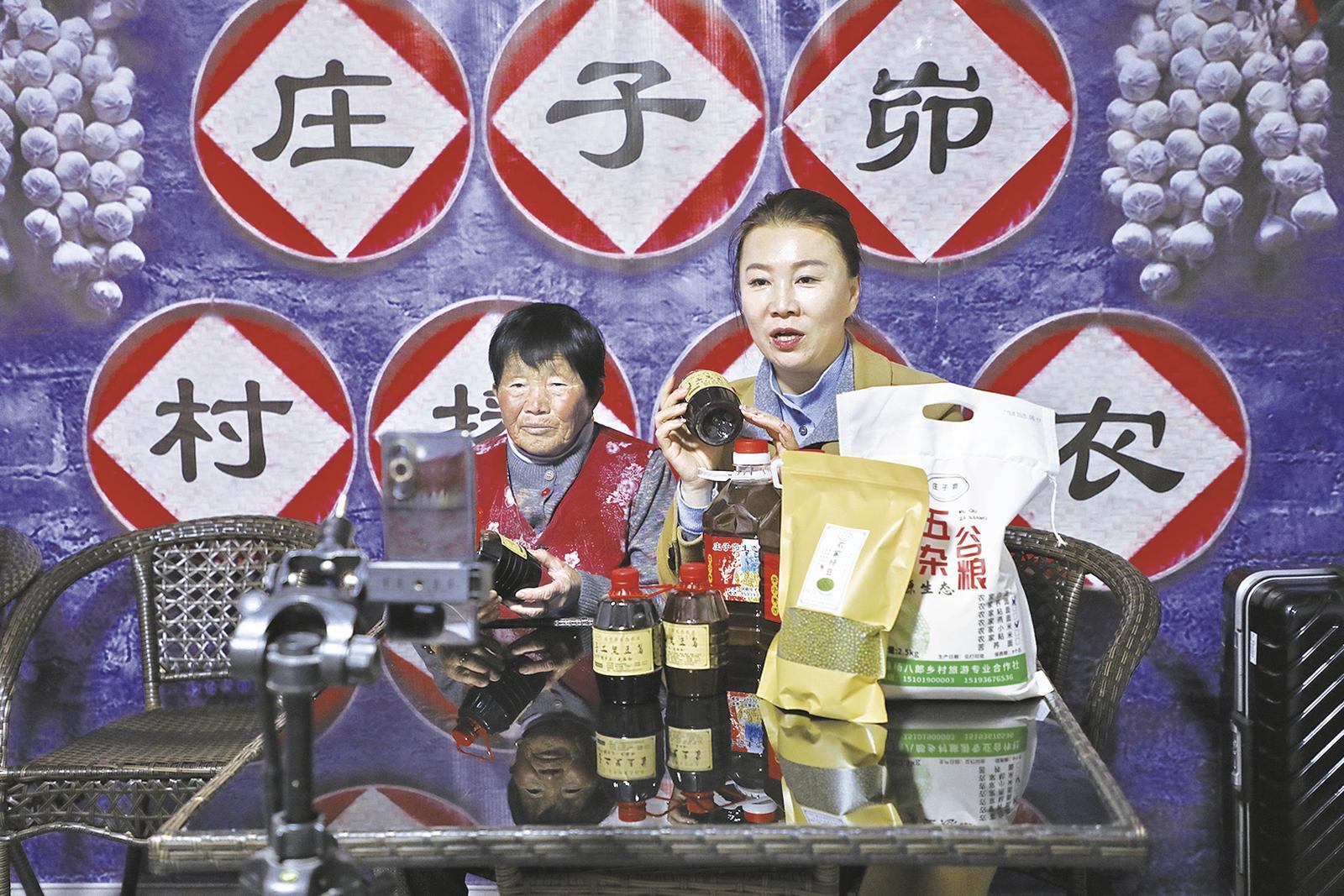 楊清艷(右)和陳有蓮直播賣農(nóng)產(chǎn)品。