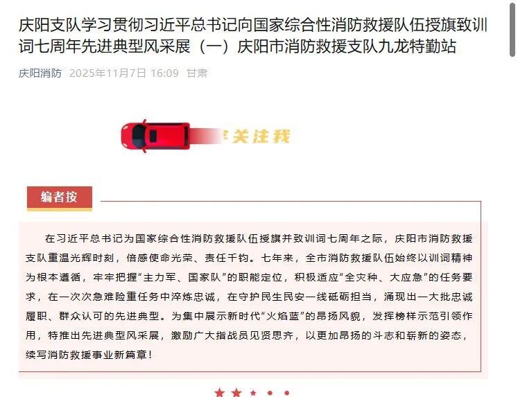 支隊(duì)整合資源,構(gòu)建“主流媒體+網(wǎng)絡(luò)新媒體”立體宣傳矩陣。利用兩微一抖等新媒體平臺,策劃推出“慶陽支隊(duì)學(xué)習(xí)貫徹習(xí)近平總書記向國家綜合性消防救援隊(duì)伍授旗致訓(xùn)詞七周年先進(jìn)典型風(fēng)采展”系列主題報(bào)道、“我們這七年”集體成果展,利用圖文、短視頻深度宣傳典型故事,展現(xiàn)隊(duì)伍建設(shè)成果,樹立英勇無畏、竭誠為民的良好形象。