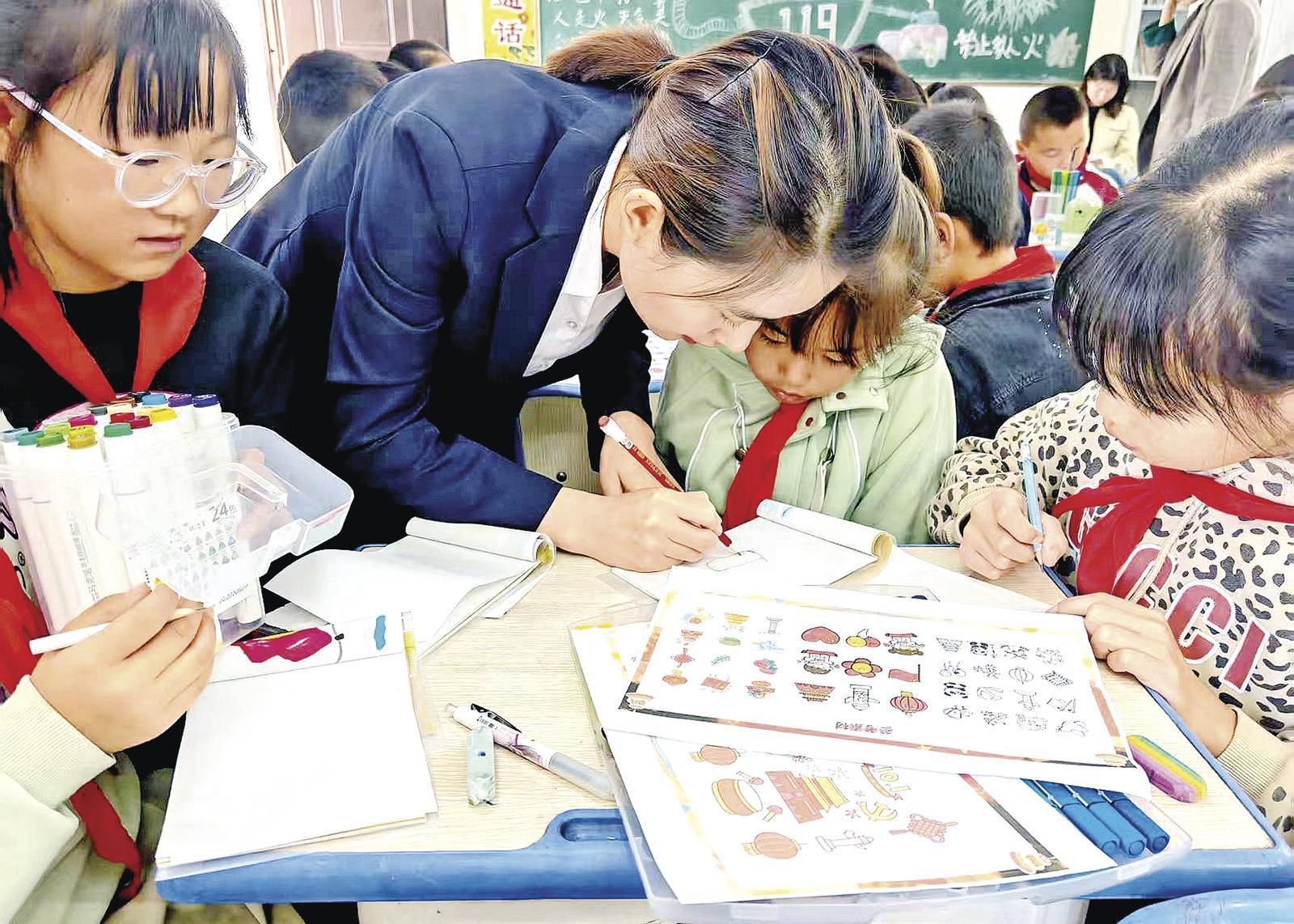 ▲慶陽六中老師教懷安小學(xué)學(xué)生畫畫。