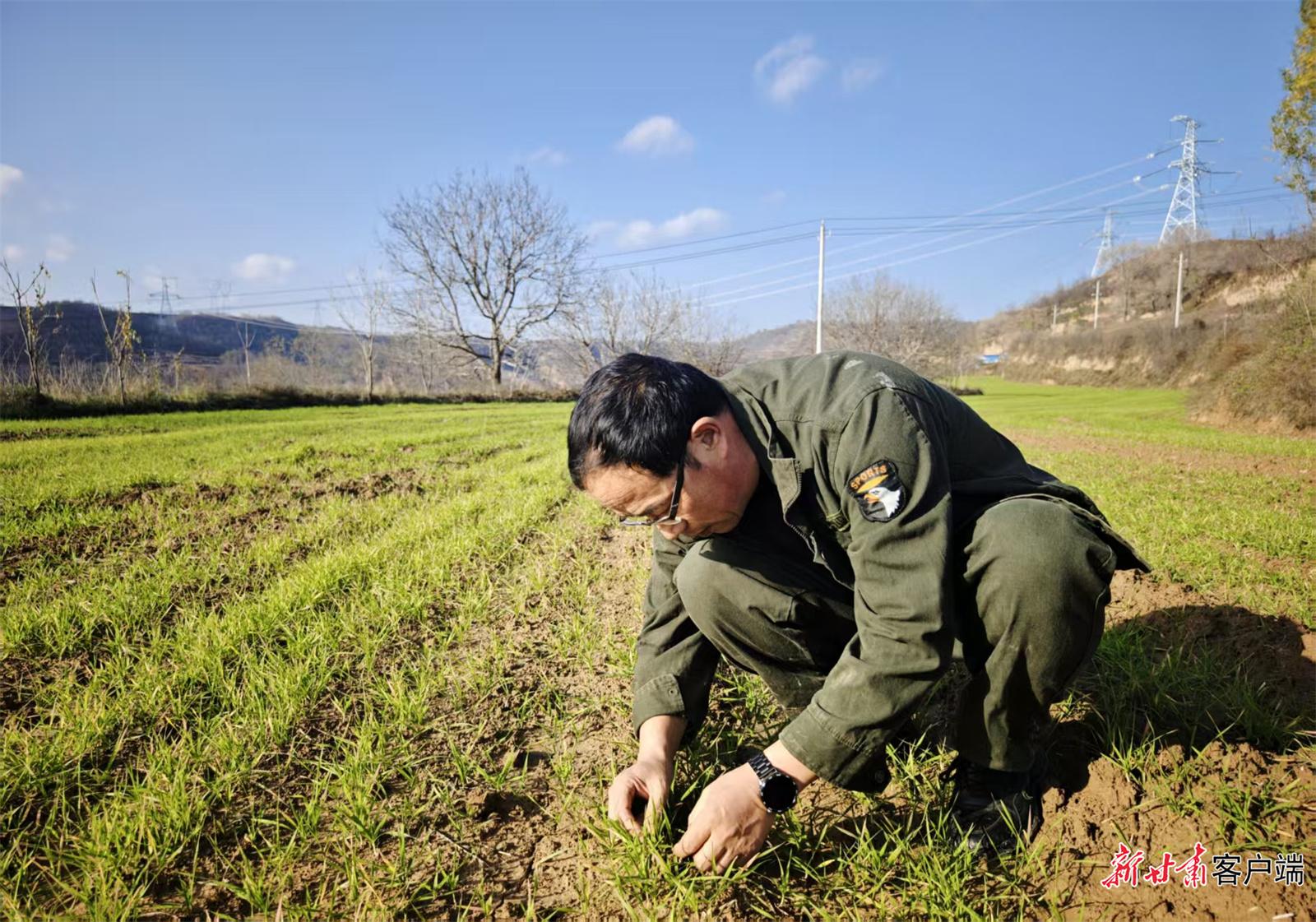 馬登云查看麥苗長勢。本文圖片除署名外均由新甘肅·甘肅日報記者 田麗媛攝