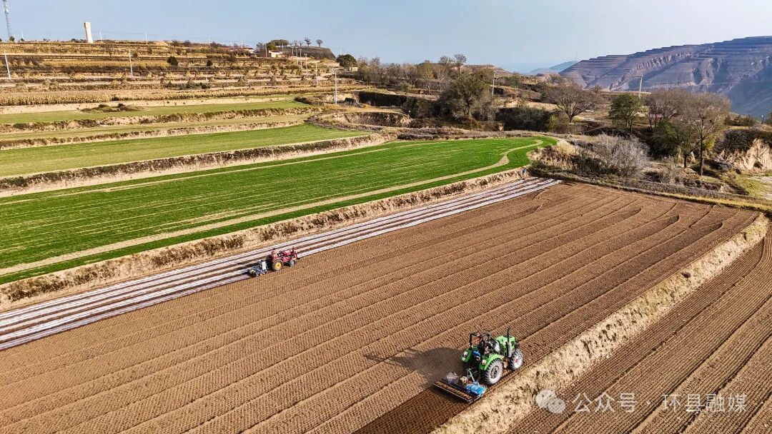 秋陽映沃野,覆膜搶農(nóng)時。秋收過后,環(huán)縣廣袤的梯田上再次忙活起來,田間地頭人來人往、機械轟鳴,一條條帶狀地膜在陽光照射下泛出銀白色光芒,為農(nóng)田“穿”上閃亮的“秋”裝,形成了一道獨特的秋日鄉(xiāng)村風景圖。
