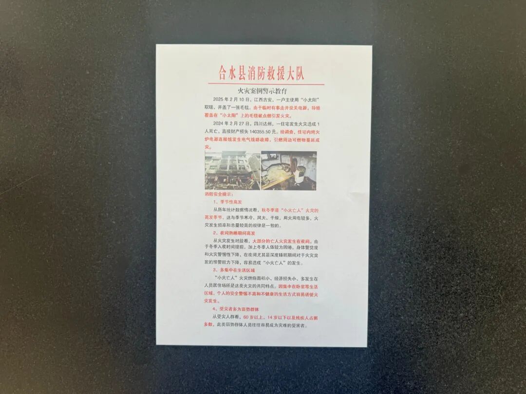 11月13日,合水消防宣傳人員深入轄區(qū)人員密集場所,廣泛宣傳張貼消防安全火災(zāi)警示案例。