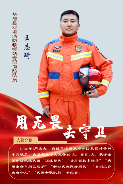 王志琦,男,漢族,1990年1月生,甘肅華池人,2016年加入消防救援隊(duì)伍,現(xiàn)任華池縣雙塔消防救援站特勤班駕駛員。入職以來(lái),他嚴(yán)于律己,積極參訓(xùn),立足崗位兢兢業(yè)業(yè)、恪盡職守,獲隊(duì)伍內(nèi)外一致好評(píng),先后榮獲總隊(duì)“三等功”1次、支隊(duì)“嘉獎(jiǎng)”2次,被國(guó)家消防救援局評(píng)為“訓(xùn)練標(biāo)兵”,被甘肅省五部門(mén)聯(lián)合表彰為“甘肅省技術(shù)標(biāo)兵”,被慶陽(yáng)市消防救援支隊(duì)評(píng)為“冬訓(xùn)工作先進(jìn)個(gè)人”。
