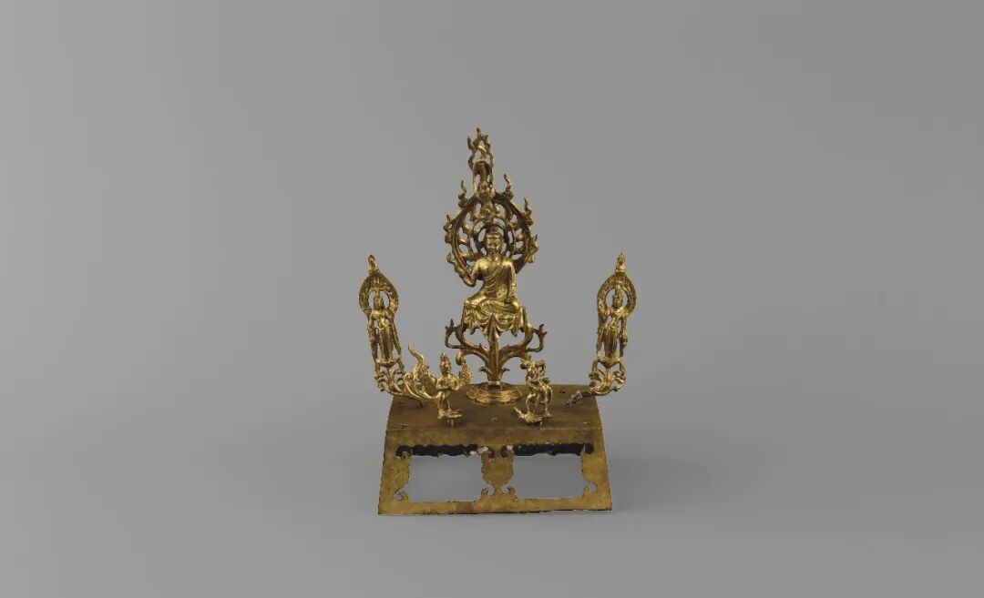 出土于鎮(zhèn)原縣新集鄉(xiāng),1996年被評定為一級文物。主體基座為長方形壸門臺座,主尊阿彌陀佛結(jié)跏趺坐于忍冬枝蔓托舉的蓮臺上。高肉髻,大耳垂肩,面相豐滿圓潤,眉如彎弓,眉間有白毫,雙目俯視,神態(tài)沉靜慈祥;蓮瓣形頭光較大,由鏤空式三重火焰紋組成,頭光頂端有一向下飛翔而來的飛天;佛著袒右式袈裟,衣紋流暢自然,佛衣下擺自蓮臺上垂搭而下。