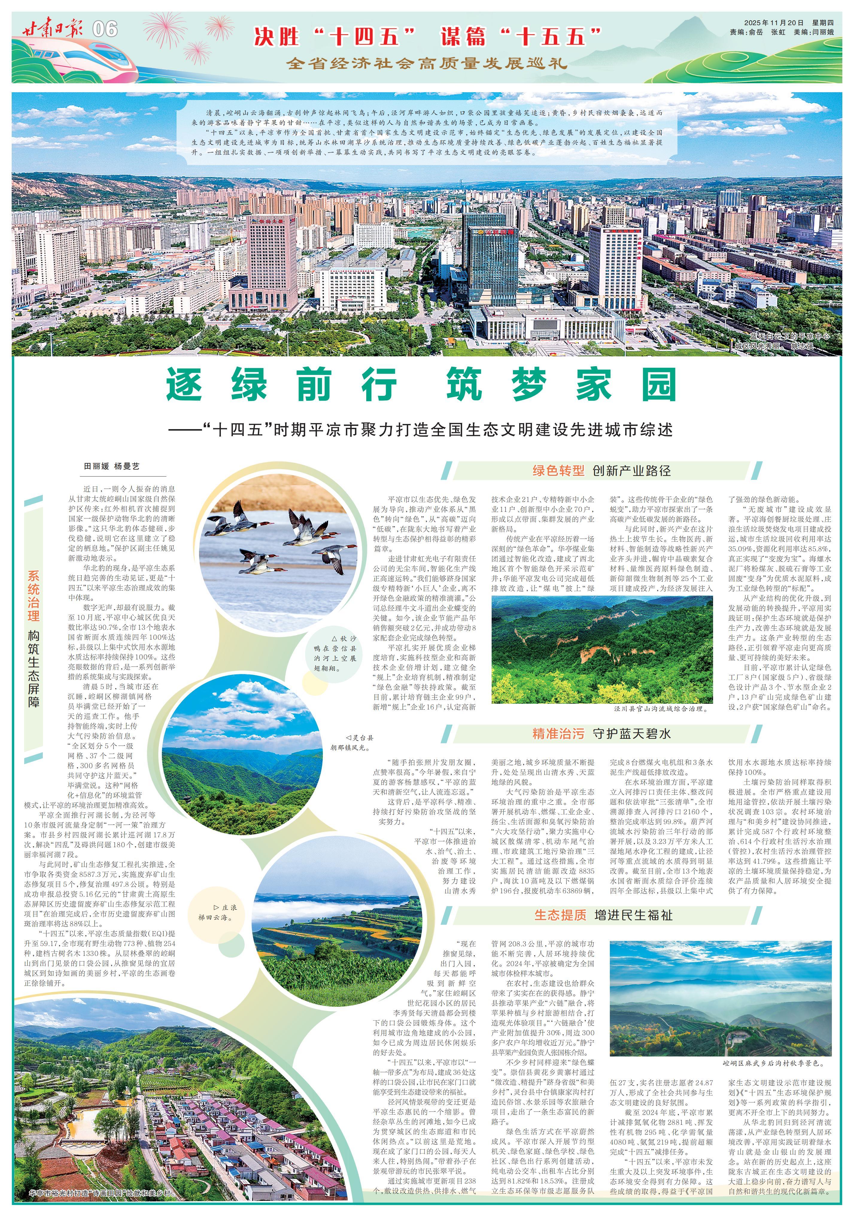 “十四五”以來,平?jīng)鍪凶鳛槿珖着?、甘肅省首個(gè)國家生態(tài)文明建設(shè)示范市,始終錨定“生態(tài)優(yōu)先、綠色發(fā)展”的發(fā)展定位,以建設(shè)全國生態(tài)文明建設(shè)先進(jìn)城市為目標(biāo),統(tǒng)籌山水林田湖草沙系統(tǒng)治理,推動(dòng)生態(tài)環(huán)境質(zhì)量持續(xù)改善、綠色低碳產(chǎn)業(yè)蓬勃興起、百姓生態(tài)福祉顯著提升。一組組扎實(shí)數(shù)據(jù)、一項(xiàng)項(xiàng)創(chuàng)新舉措、一幕幕生動(dòng)實(shí)踐,共同書寫了平?jīng)錾鷳B(tài)文明建設(shè)的亮眼答卷。
