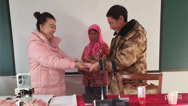 楊清艷給村民分紅(央廣網發(fā) 李文 攝)
