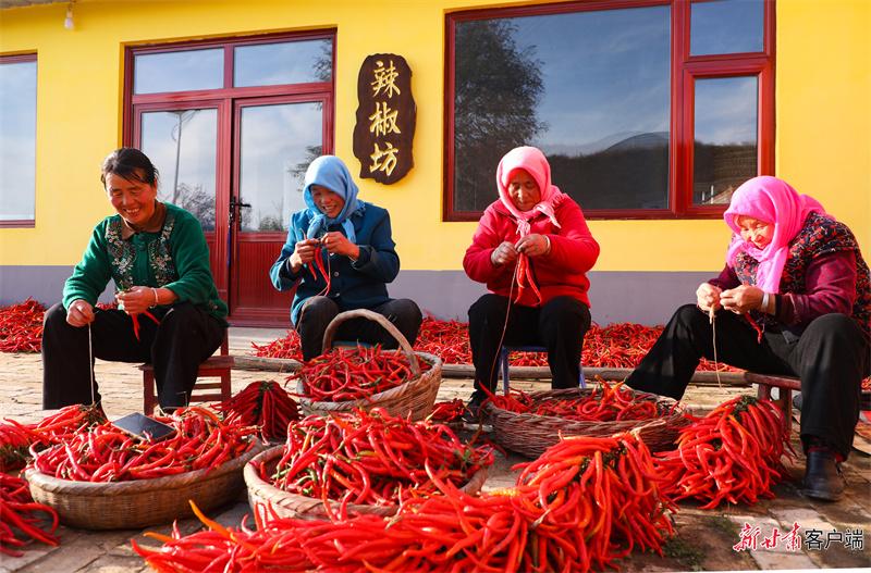 “辣嬸子”陳歲香和村民一起串辣子。 新甘肅·甘肅日?qǐng)?bào)通訊員 喬潔攝