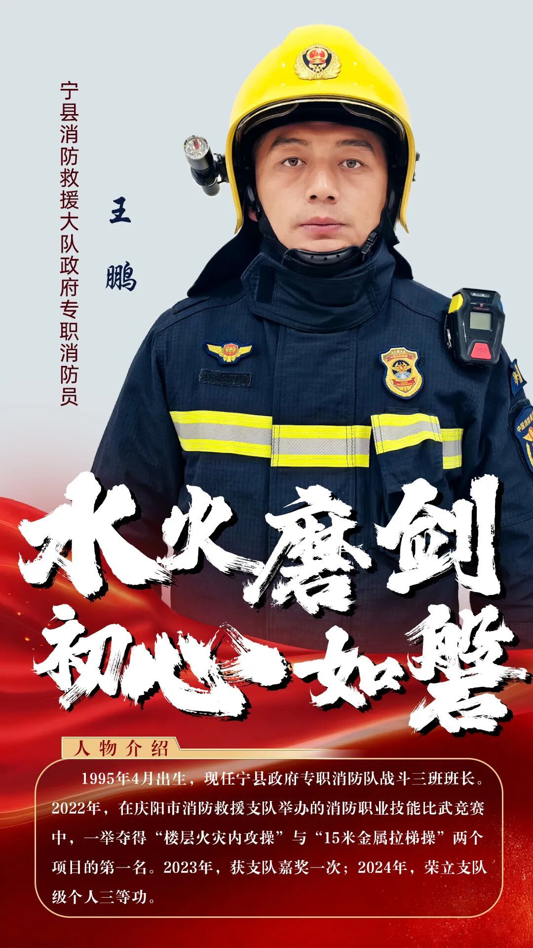 王鵬,男,漢族,1995年4月出生,現(xiàn)任寧縣政府專職消防隊戰(zhàn)斗三班班長。自2021年加入消防救援隊伍以來,他始終戰(zhàn)斗在滅火救援第一線,累計參與處置各類災害事故150余起,保護人民群眾財產(chǎn)價值20余萬元。該同志政治立場堅定,作風扎實過硬,能力素質(zhì)突出,在2022年慶陽市消防救援支隊舉辦的消防職業(yè)技能比武競賽中,他勇奪“樓層火災內(nèi)攻操”與“15米金屬拉梯操”雙項冠軍;2023年獲支隊嘉獎;2024年榮立支隊級個人三等功。