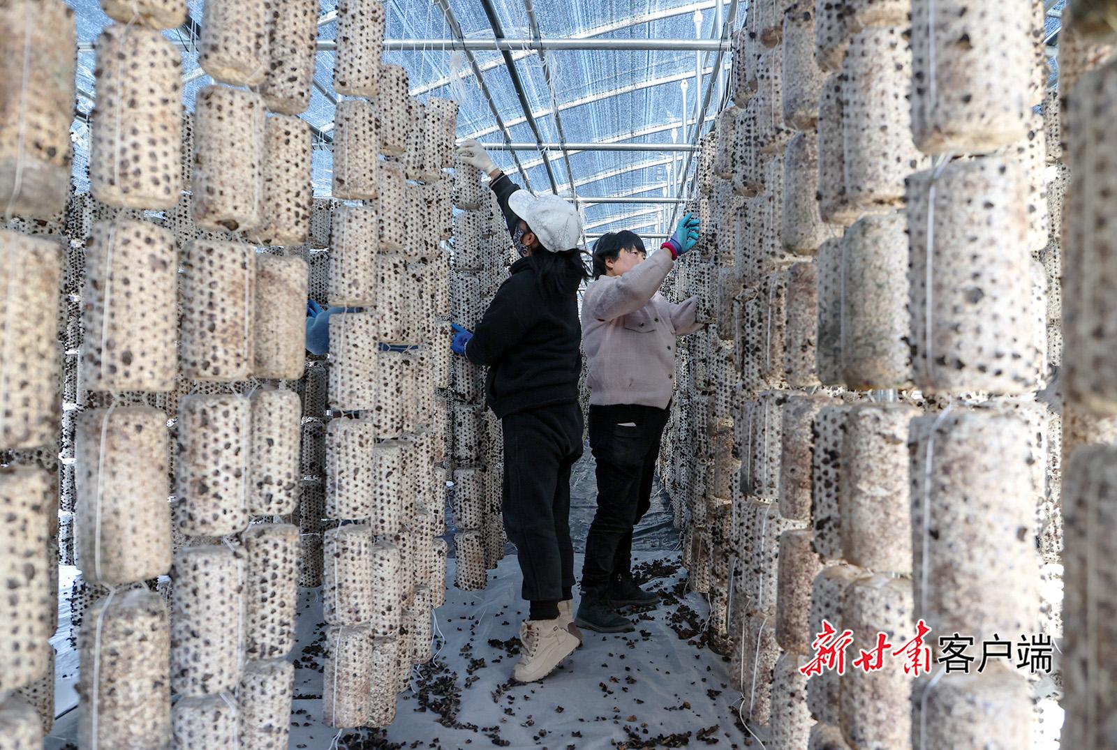 11月25日,合水縣老城鎮(zhèn)木耳出口產(chǎn)業(yè)園,農(nóng)戶正在采收、晾曬木耳。