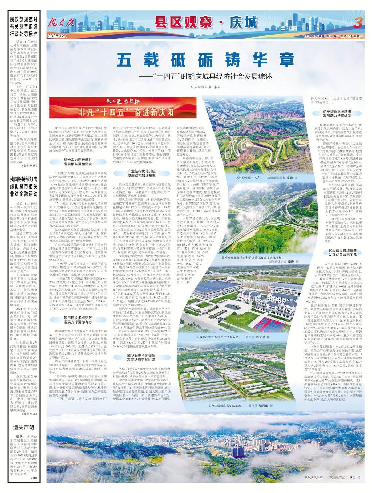 歲月不居,時節(jié)如流?!笆奈濉逼陂g,慶城縣始終以習(xí)近平新時代中國特色社會主義思想為指導(dǎo),在沃野田疇夯實(shí)根基,在工業(yè)園區(qū)積蓄動能,在城市街巷激發(fā)活力,在糧食安全、產(chǎn)業(yè)升級、城鄉(xiāng)建設(shè)、民生改善的實(shí)踐中步履鏗鏘,交出了一份“量的合理增長”與“質(zhì)的有效提升”協(xié)同并進(jìn)的亮眼答卷。