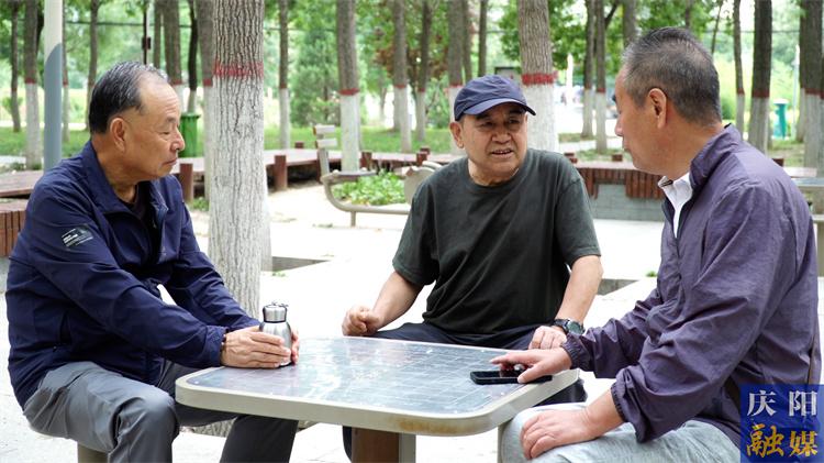 ▲馬步升(中)和家鄉(xiāng)作家在公園交流寫作心得。慶陽融媒記者 敬強強攝