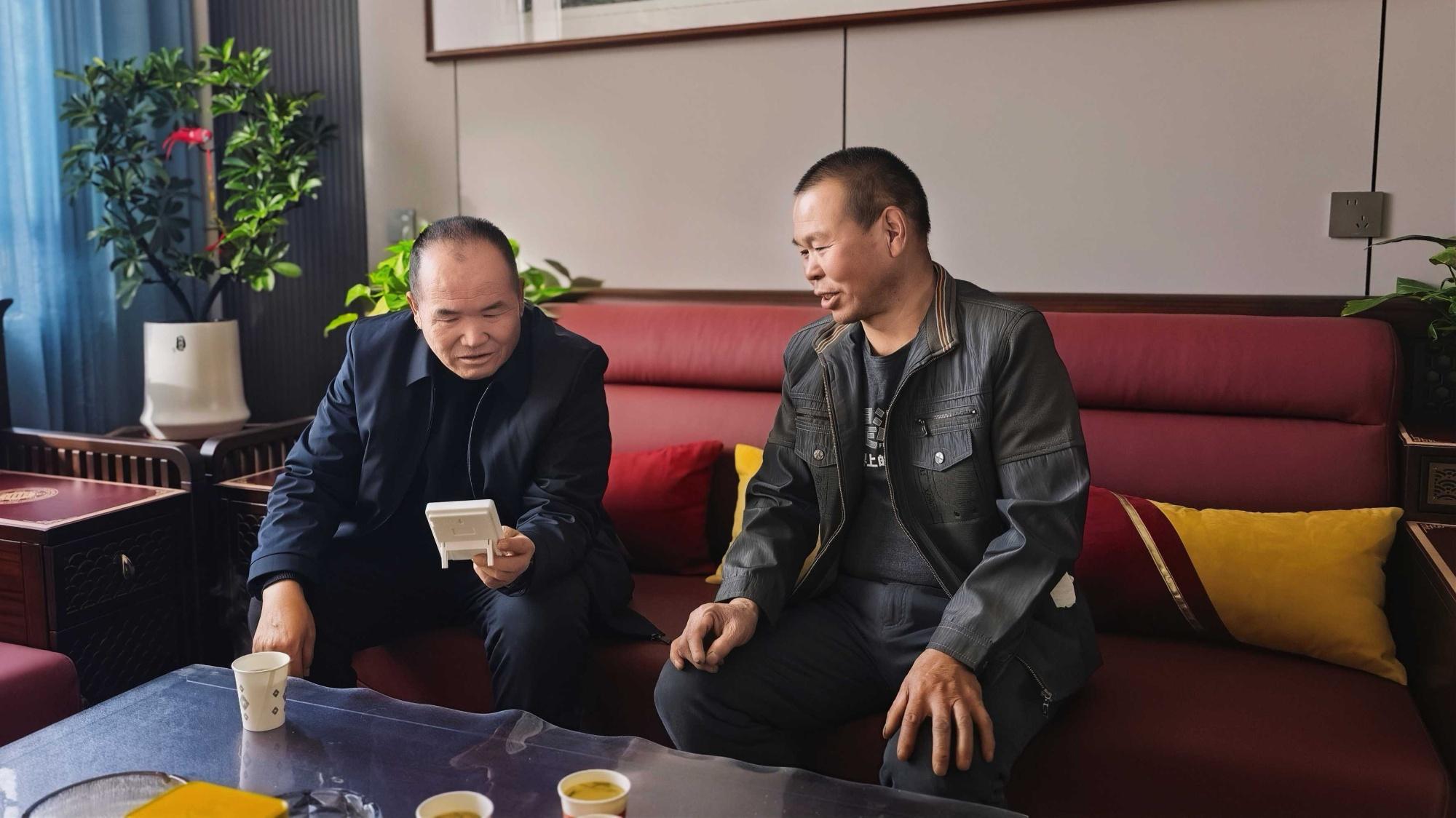 西峰區(qū)什社鄉(xiāng)避險(xiǎn)搬遷群眾齊衛(wèi)忠與村民探討空氣能取暖設(shè)備用電情況(西峰區(qū)融媒體中心供圖)